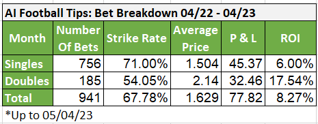This methodology is working. Since April 2022, AI Football tips have put 1,896 global football selections forward from across the 1×2 markets in the form of both singles and doubles, with the following headline results: