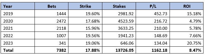 So whilst there is an edge if you have the ability to bet with bookmakers, there is still a decent profit to be made if only taking Betfair SP (results are also after 2% commission has been deducted).