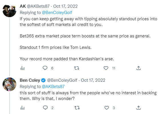 Sporting Life golf tipster Ben Coley had a lengthy Twitter debate with professional punter and bookmaker Anthony Kaminskas about his record and taking early/standout prices