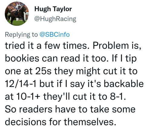 In fairness, this is a conundrum for those involved. Tipsters with the largest followings. who provide their work for ‘free’, are victims of their own success. Impressive historical records and prominent platforms mean that their advice will always result in large volumes of bets being placed on the same selections. Prices will contract. To compound this, there is also evidence that bookmakers will watch out for their bets being released and cut prices before taking too much money on them and risking excess exposure.