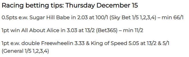 Selections are often provided with price alternatives e.g. ‘General’ if the price is available across the board or with precise options e.g. 11/1 4plc (SkyBet), 12/1 3plc (Bet365, Paddy Power). If a drift is expected, horses will even be advised at SP (or BSP).