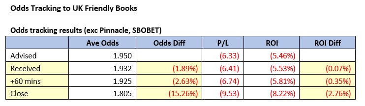 The odds movement analysis was a small subset of the service’s bets but if we assume the pattern remains for the overall picture then we can also assume we will be profitable taking these bets at UK-friendly bookmakers.