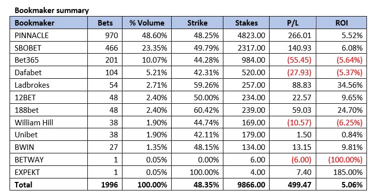 There’s also significance in the performance by bookmaker table which clearly demonstrates Sergio’s edge at ‘sharp’ bookmakers Pinnacle and SBOBET.