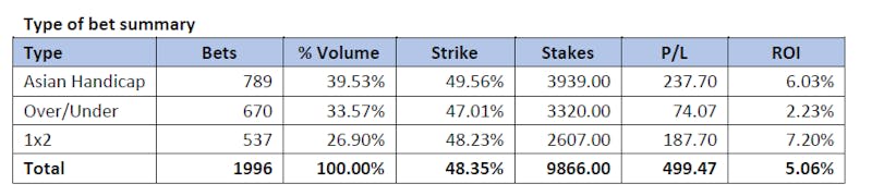 We see here that both Asian Handicap and 1X2 bets are the most profitable with over/under bets being the least profitable (but still in profit).