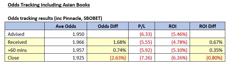 Then perhaps most importantly for non-Pinnacle bettors, the below two tables show the odds tracking analysis we performed which monitored the odds movements on bets advised.